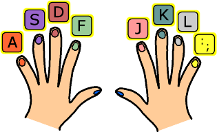 Place your fingers gently on their respective keys now, light enough so that you are not actually pressing them! This is where your fingers "hang out" when they're not typing, and where they "spring" back to just after they have finished typing another key somewhere else. It is very important for your fingers to be able to go to these keys at any time, at a split second's notice. Practice taking your hands away and placing them on these keys several times, until you can do it confidently, and without looking.
