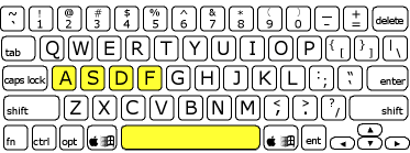 Welcome to Lesson 1! First, a little orientation: at the top of every lesson you'll see a diagram of the keyboard that highlights in yellow the keys you will be working on. In subsequent keyboarding lessons the keys you have already learned but are not the focus of the lesson will be coloured green. It is vital that you will have mastered those keys before moving onto a new lesson. Mastery, for purposes of this course means that you can confidently and consistently type a lesson exercise in under 60 seconds with NO errors.