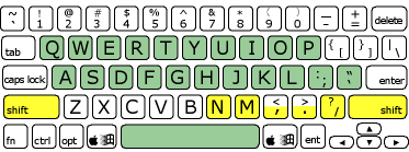 So, to recap, only two letters for the right hand in the bottom row: M & N (both pressed by the index finger), all other bottom row letters are under the left hand. It helps to remember that when you're trying to learn where things are!